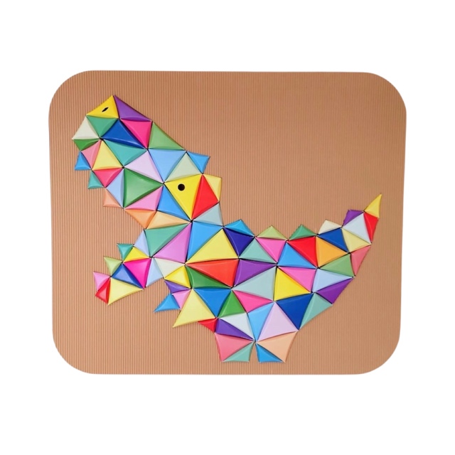 三角形に折ったカラフルな薄いダンボールを、枠にはめこんで恐竜の形しました。